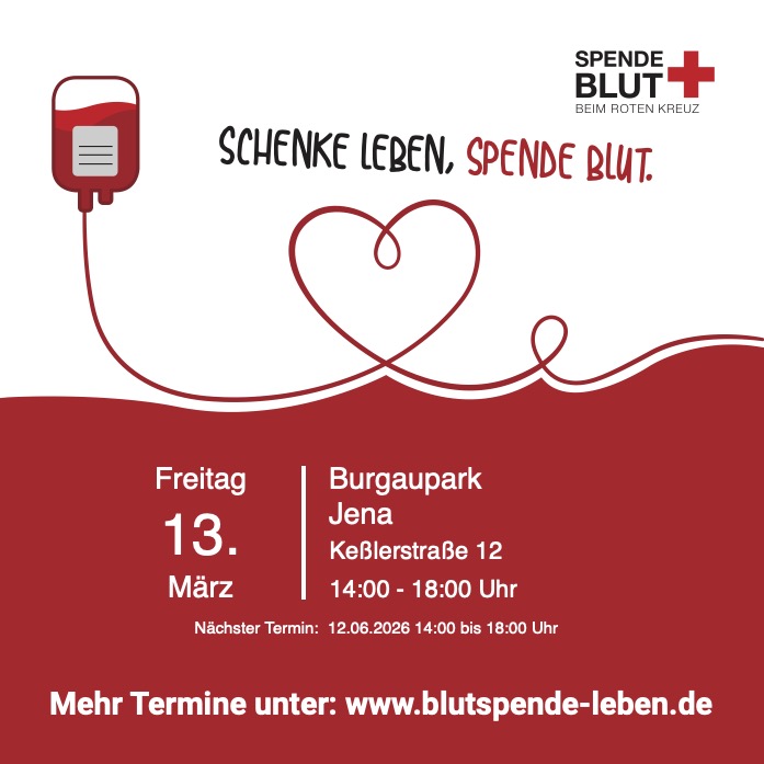 Schenkt Leben und spendet Blut! Am 13. März ist das Rote Kreuz von 14–18 Uhr im Burgaupark. Kommt vorbei, zeigt Herz und werdet Lebensretter.